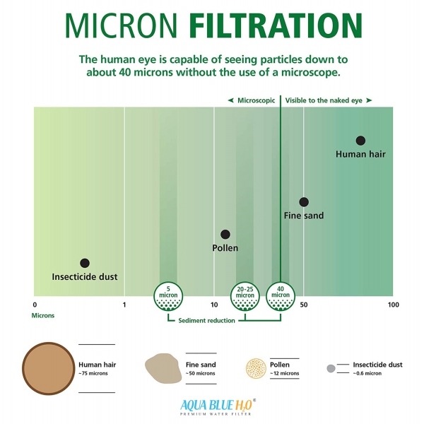 Tested and certified against NSF/ANSI 50 for material safety. AQUA BLUE H20 water filters offer you a safe drinking experience.Lead-free materials. Large capacity for removing particles, rust, limescale, and sediment.
