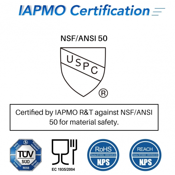 • NSF/ANSI 50: Certificate W-11809, by IAPMO, 2020.
